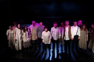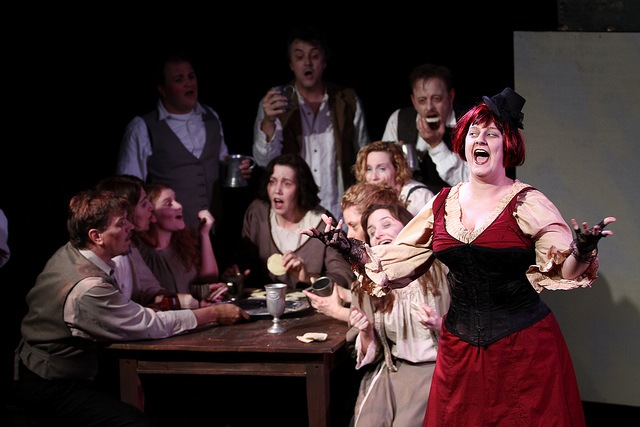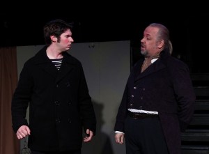 Ken Post does an admirable job in portraying Sweeney Todd as a dark, emotionally tortured and brooding figure consumed by a lust for revenge. The danger in having such a strong morose lead character is that it can infect the entire performance and the audience as well; sapping energy and coming off a bit heavy, but four things prevent that from happening. First, Ken successfully navigates the full range of manic emotions from his shrill highs to his emotionally dead lows – all inspiring gasps of shock or laughter from the audience. Secondly, he is cast against the enchanting Arwen Morton who plays the gregarious and outspoken, though morally compromised Mrs. Lovett. Together they strike a wonderful balance of contrasting personalities and keep their scenes (even the disturbing ones) engaging, high energy and fun. They have great chemistry and each effectively helps to balance out the other. Thirdly, it seems as if every scene as it’s about to lose energy gets reinvigorated by the delightful repeated walkthroughs of the Beggar Woman (Kate Witt) who somehow manages to steal every scene that she’s in. Fourthly, the supporting cast is quirky and strangely wonderful; helping to keep the bawdy, guilty pleasure that is Sweeney Todd, an entertaining, over-the-top, rollicking ghoulish rollercoaster ride through the darker side of life.