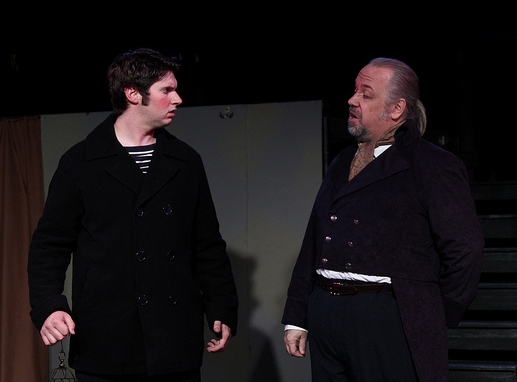 Consumed by revenge against the judge, Todd befriends Mrs. Lovett, an opportunistic but infamously terrible pie maker and goes through the motions of resuming his work as a barber, sustained only by the thought of one day getting his revenge on Judge Turpin. As fate would have it, a young sailor Todd befriended on the voyage home falls in love with Joanna (Teresa Macdonald) but Judge Turpin, secretly desiring Joanna for himself, forbids the sailor Anthony Hope (Billy Holdsworth) from speaking to her. Anthony Hope is aptly named as he, and to a lesser degree Joanna, seems to represent the moral conscience in the play and Hope remains faithfully committed to that role, never selling out. The plot is set into motion, for love will not be denied, nor will the all-consuming lust for revenge.